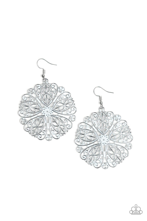 Brushed in a refreshing white finish, ornate silver filigree spins into a whimsical floral pattern for a seasonal flair. Earring attaches to a standard fishhook fitting.