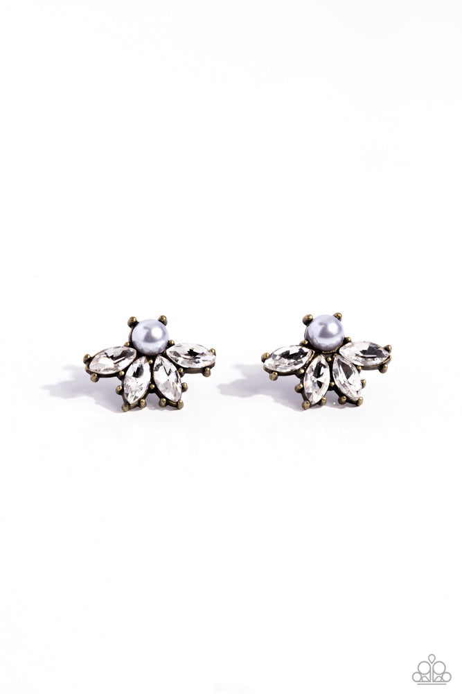 Encased in pronged brass fittings, marquise cut rhinestones fan out from the bottom of a dainty pearl for a vintage inspired fashion. Earring attaches to a standard post fitting.