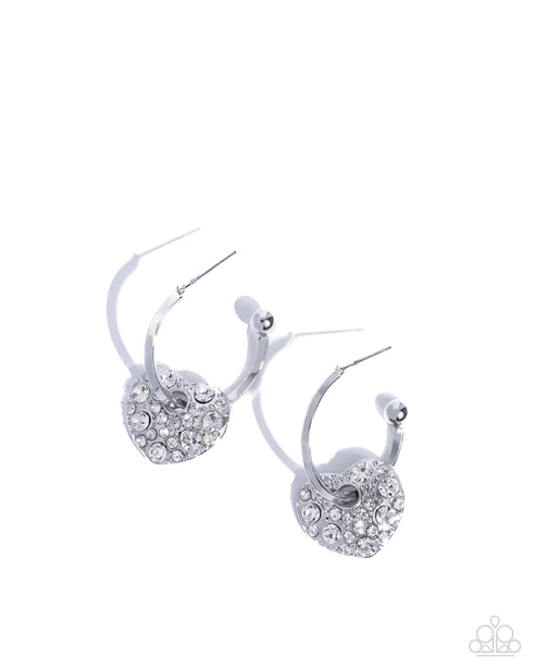 Infused along a sleek silver hoop, white rhinestones in varying sizes glitter and gather atop a silver heart pendant for a romantically radiant display along the ear. Earring attaches to a standard post fitting. Hoop measures approximately 7/8" in diameter.