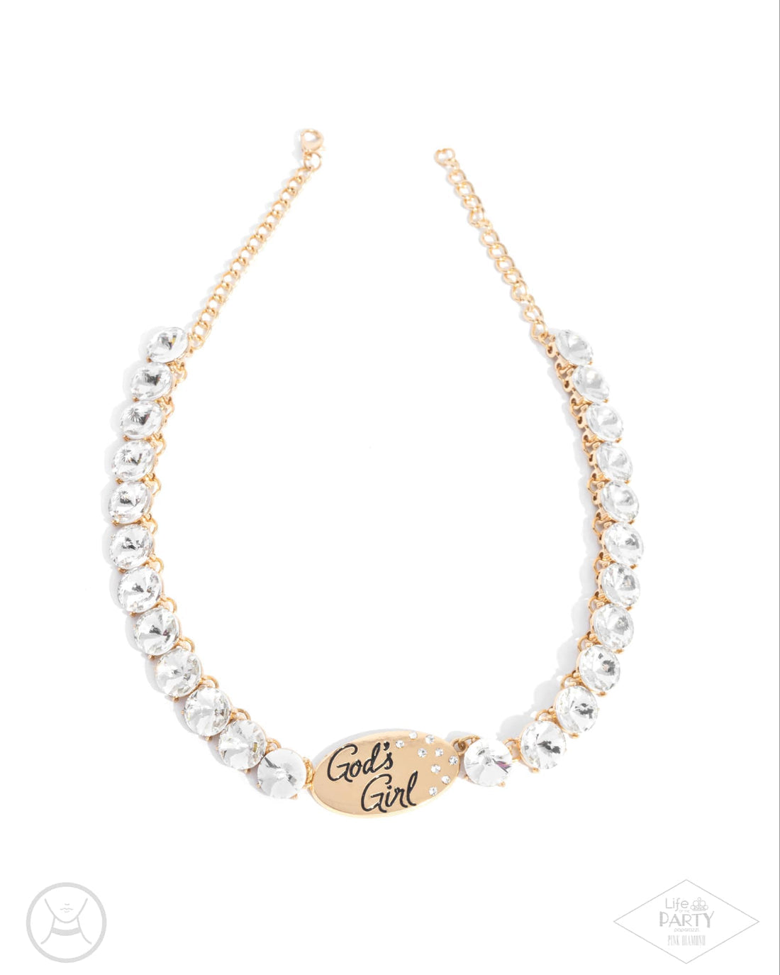 Infused along a classic gold chain, a flashy collection of gold-pronged white gems shimmer and shine down the neckline to an oval silver plate. The phrase "God's Girl" is stamped in a curly font on the plate beside a dusting of dainty white rhinestones for an inspirational finish. Features an adjustable clasp closure.