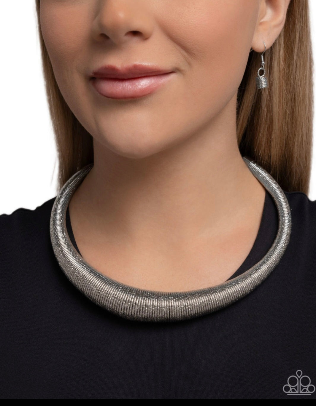 A thick silver frame is comprised of tightly coiled metallic wires, creating a sleek and industrial-inspired design that hugs the neck with bold refinement. Features an adjustable clasp closure.