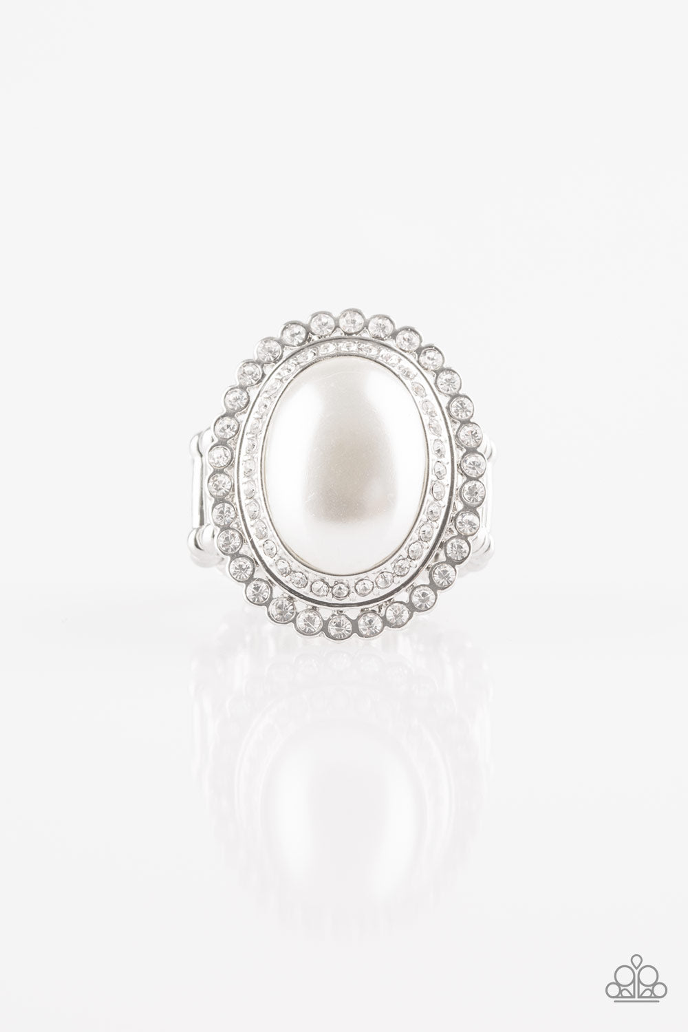 A pearly white bead adorns the center of stacked silver frames encrusted in glassy white rhinestones for a dramatically refined look.