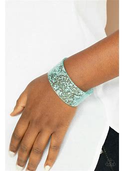 Dainty silvery shavings are encased in a thick blue acrylic cuff, creating an icy incandescence around the wrist.